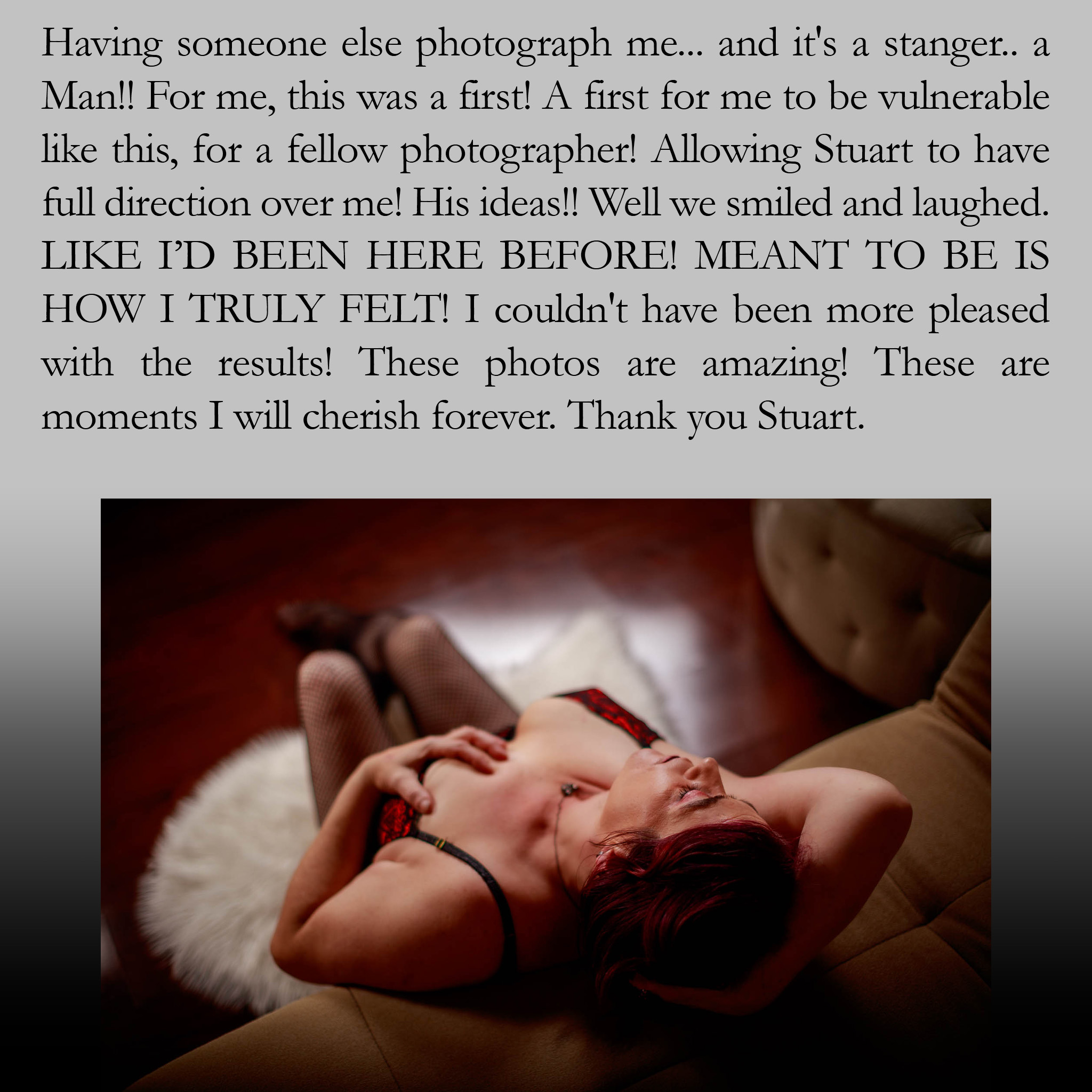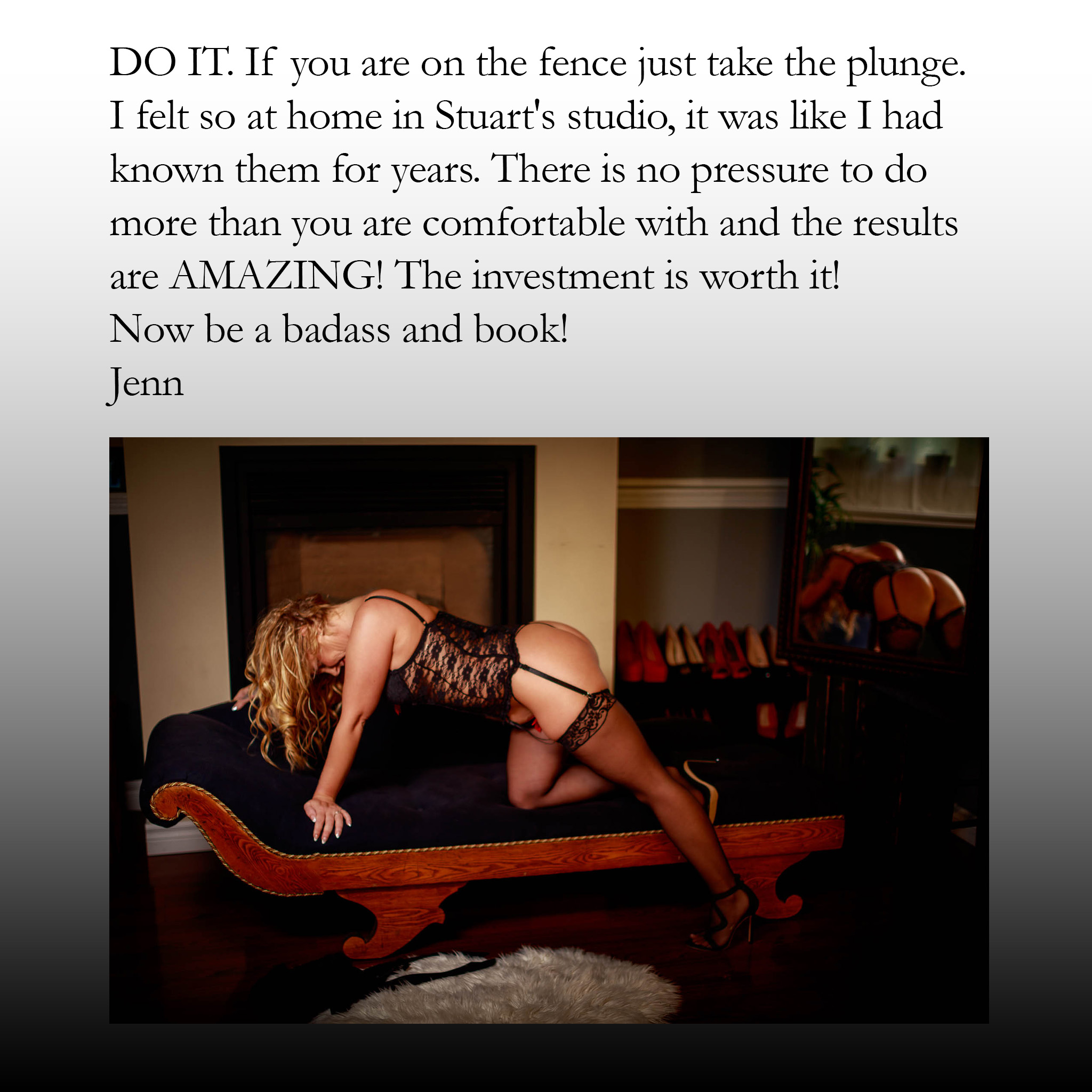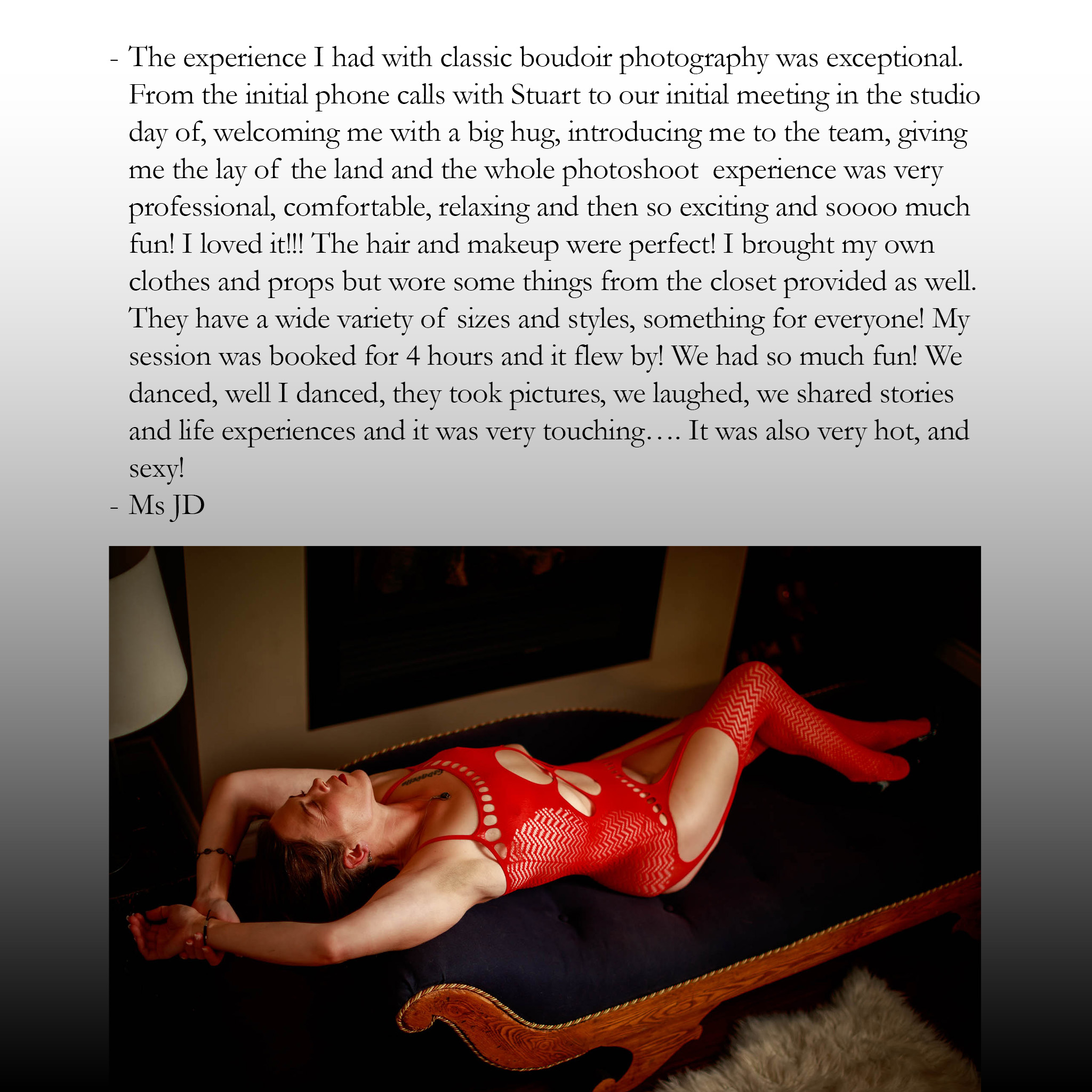 I’ve built my reputation on the five-hour long luxurious pampering experience. I still believe that the "slow burn" is the ideal format for a luxurious boudoir experience. That experience is the heart of my studio, and it always will be.